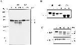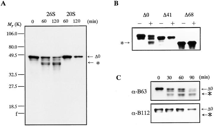 Figure 6. Digestion of goldfish cyclin B by the Xenopus 26S proteasome. Cyclin was visualized by immunoblotting with B63 (A–C) and B112 (C). The position of the digested cyclin B is indicated by asterisks. (A) Digestion of full length cyclin B. Cyclin Δ0 (5 μg/ml) was incubated at room temperature with purified 20S or 26S proteasomes (60 μg/ml) in the reaction buffer (100 mM Tris-HCl, 5 mM MgCl2, 0.04 mM ATP, pH 7.6). Samples were exposed to Laemmli's SDS sample buffer at the indicated times during incubation. (B) Digestion of truncated cyclin B. Cyclins Δ0, Δ41, and Δ68 were incubated in the absence (−) or presence (+) of 60 μg/ml of 26S proteasome for 120 min at room temperature. (C) Cyclin was digested by Xenopus 26S proteasomes at the NH2 terminus. Goldfish cyclin Δ0 was digested by 26S proteasome for the indicated times and then stained with B63 or B112 antibody.