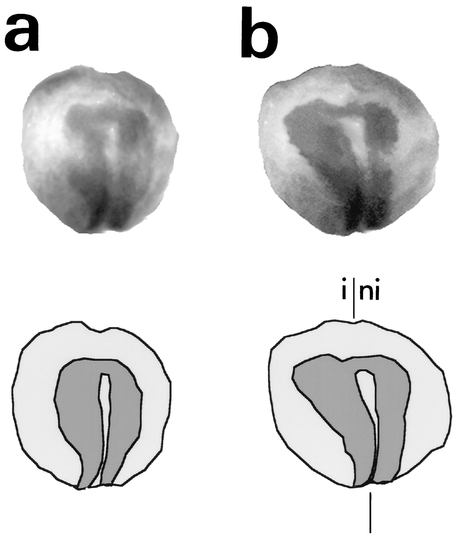 Phenotype of Relax/XE12-injected Xenopus embryos at stage 14. (Top) In situ hybridization of an N-CAM digoxygenin-labeled riboprobe in noninjected (a) and Relax/XE12-RNA-injected (b) embryos. (Bottom) Schematic representation of both embryos; dark gray represents the N-CAM label. The injected side (i) and the noninjected side (ni) of the embryo are indicated. The symmetric axis is represented by two vertical lines. All injected embryos presented a phenotype similar to those shown here.