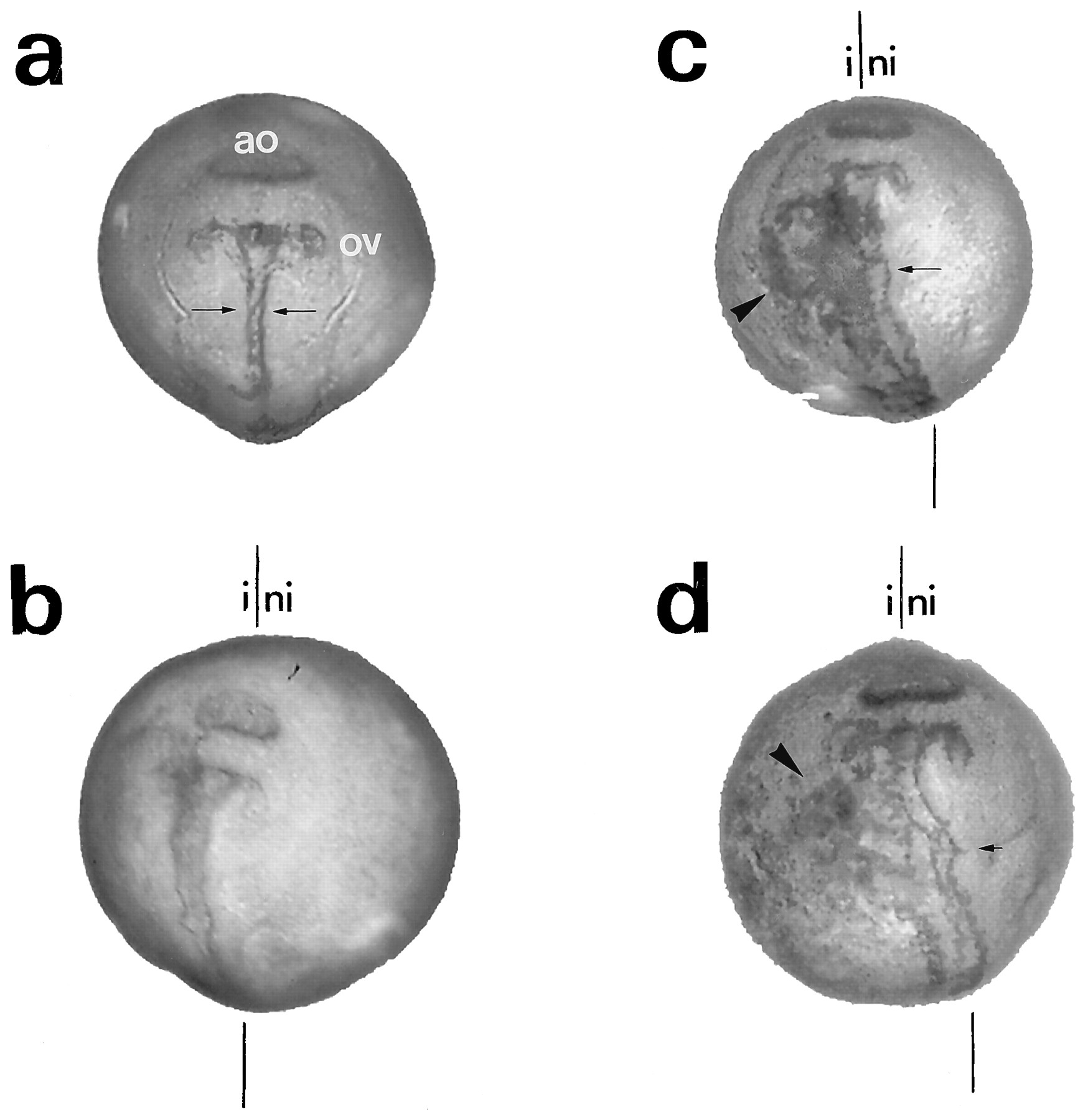 Persistence of the ectopic expression of Relax at the late neurula stage. Immunocytochemistry with N-CAM (aâc) and β-tubulin (d) antibodies (1:100) of noninjected (a), XE12 RNA-injected (b), and Relax/XE12 RNA (c and d) embryos at development stage 20. The adhesion organ (ao), the optic vesicle (ov), and the injected (i) and the noninjected sides (ni) of the embryo are indicated. Arrows indicate neural tube labeling; arrowheads indicate ectopic labeling. The symmetric axis is represented by two vertical lines. All the injected embryos presented a phenotype similar to those shown here.
