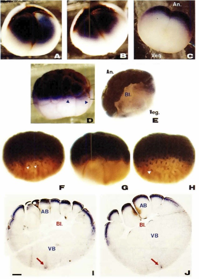 Fig. 2. Whole-mount in situ hybridization for ets-1 and ets-2 in early embryogenesis. (A) Localization of ets-1 transcript in the animal pole of a 4-cell embryo. The cleavage furrows are clearly indicated by residual dark-brown pigmentation. (B). Same experiment conducted for ets-2 transcripts. (C) Control experiment in which a 2-cell stage embryo was cut into halves prior to hybridization to exclude possible artifacts resulting from a poor penetration of the anti-digoxigenin antibody (ets-1 antisense probe). An, animal pole; Veg, vegetal pole. (D) ets-1 mRNA localization in a 32-cell stage blastula, showing the presence of transcripts In the animal blastomeres and in the upper part of vegetal blastomeres (blue arrowheads). (E) Same experiment carried out on a 32- cell stage embryo cut into halves prior to hybridization. Note the presence of the transcripts (dark-blue staining) in the roof of the blastocoel and in the marginal zone. An, animal; Veg, vegetal; BI, blastocoel. (F,G,H) Whole-mount inSitu localization of ets-1 (F) and ets-2 (G,H) in stage 8 (F and H) and stage 6 (G) embryos. In addition to the animal pole cytoplasmic localization of the transcripts, notice the nuclear signal which can be observed in stage 8 embryos, at the level of the vegetal part, in the almost colorless cytoplasmic background. The specificity of this signal is assessed by the fact that no nuclear staining is observed in embryos prior to MBT (compare F and H with G) and by the fact that a sense probe does not give any signal (not shown). The proliferative activity of these cells is demonstrated by the presence of duplicated nuclei (white arrowheads in F) and a mitotlc figure (white arrowhead in H), in cells which have not yet undergone cytokinesis. (I,J) 10um thick sections of whole-mount hybridizations on a 32-cell stage (ets-1) and 16-cell stage (ets-2) embryos respectively. The transcripts are essentially located below the cortex of the animal blastomeres, but a significant level of both ets-1 and ets-2 mRNAs is also observed at the level of the germ plasms (red arrows). AB, animal blastomere; BI, blastocoel; VB, vegetal blastomere. Bar, 100 um.