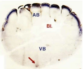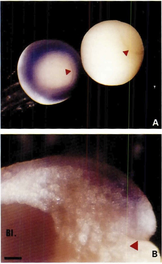 Fig. 3. Ets-1 transcript localization in Xenopus laevis gastrula (stage 101121. (A) Whole-mount In situ hybridizarson with antisense and sense probes (left and right embryo respectively). Ers-l transcripts dre observed as a Clfcumblastoporal collar (blue staining in the left embryo), whereas no signa/is observed with the sense probe. (BI Sect/on of astage 101/1 embryo showing the dorso-blastoporaf lip (red arrowhead) and rhe blastocoel (BL). The ets-l stainmg is mamly observed in the upper eplthebal layer of the marginal zone, and to a lesser extent In the deep marginal zone. However, cells rolling around the dorsoblastoporal lip do not seem to be labeled. In agreement with the absence of staining in a narrow cordon immediately adjacent fa the blastoporal lip in the left embryo(A) Bar, 100um.