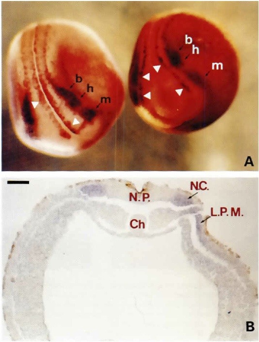 Fig. 4. Wholemount in situ detection of ets-1 transcripts in Xenopus laevis neurula ( st 15/18). (A) Stage 15 ( right embryo) and stage 18 ( left embryo). Note the presence of segregated cell masses on the external side of the neural plate, corresponding (to) the mandibular (m) hyoid (h) and branchial (b) segments of neural crest cells. Also note the thin stained line on the internal side of the elevating neural fold ( white arrowheads in stage 15 neuraula) and the corresponding labelling of the midline in the closing neural tube (white arrowheads in stage 18) embryo. (B) Horizontal section through a stage 17/78 Xenopus laevis embryo. Due to the curvature of the AlP axis, the section is almost transverse at the level of the neural plate. Segregated neural crest cell masses are conspicuously stamed on both sides of the neural plate. A clear staining is also observed in the lateral plate mesoderm. Ch, chord: LPM, lateral plate mesoderm: NC neural crest: NP, neural plate. Bar, 100 um.