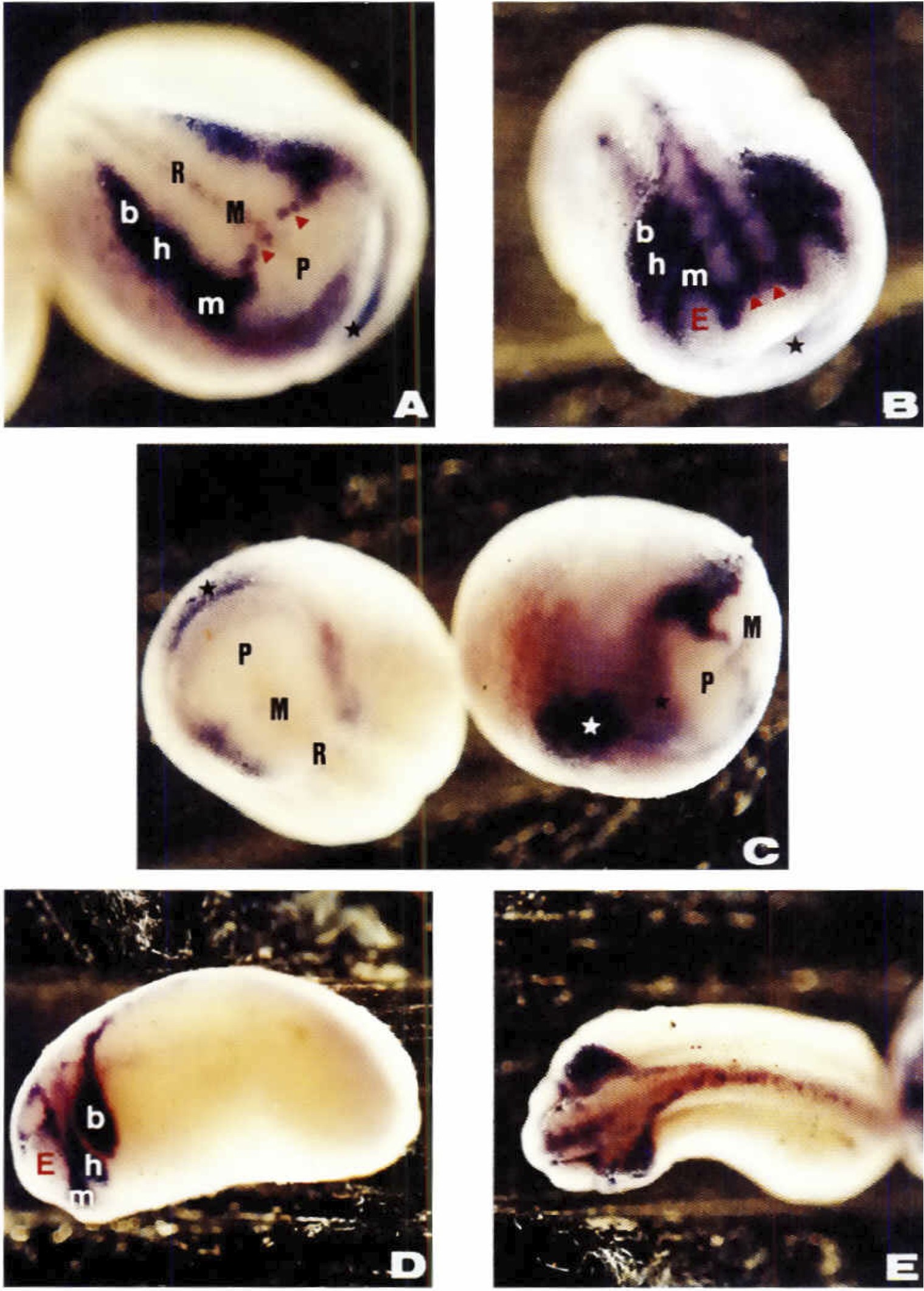 Fig. 5. Whole-mount in situ detection of ets-1 transcripts in pre-migratory and migrating neural crest cells. (A) Stage 19/20 embryo. antero-dorsal view: the mandibular (m), hyoid (h) and branchial (b) neural crest cell segments are strongly labeled; also note the punctuated label at the level of the border between prosencephalon and mesencephalon (red arrowheads). The black star shows a diffuse faint labeling in front of the most anterior part of the neural rube, normally deprived of neural crest cells and which could correspond to the hypophyseal anlage. (B) Stage 21/22 embryo. antero-dorsal view: the neural crest cells have now started their migration towards the ventral side of the embryo. The mandibular segment starts to surround the forming eye vesicle (E). Note the increase in the staining at the border between pro-and mesencephalon (red arrowheads), with respect to (A). Also notice the strong labeling at the midline of the neural tube. (C) Stage 19/20 embryo, antero-ventral view (right side embryo) and antero-dorsal view (Ieft side embryo). in addition to the labeling at the periphery of the neural tube already depicted (left side embryo), a strong staining is observed in the ventro-anterior region (white star on the right side embryo), in the putative area for heart and blood island. The faint and diffuse labeling in front of the neural tube is still clearly observed (black star). (D.E) Stage 22/23 embryos, lateral and dorsal views respectively: the neural crest cells are now populating the mandibular hyoid and branchial arches (D). The dorsal view clearly shows a labeling at the level of the vagal and truncal neural crest cells (E). b,h,m, branchial, hyoid and mandibular neural crest cell segments or arches: P,M,R, pro-, meso and rhombencephalon, respectively. E. eye vesicle.