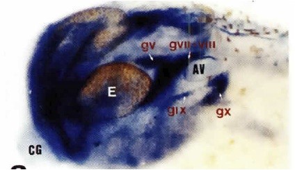 Fig. 6. Ets-1 and ets-2 are expressed in the cranial, vagal, and dorsal root ganglia. (A) Whole-mount hybridization with an ets-1 probe on stage 29/30 embryos showing a conspicuous expression of ets-1 in the cranial ganglia and in the vagal and truncal neural crest cells (respectively VC and TC). Also note the staining at the level of the condensing pronephros, in the hemangioblast precurors, in the ventral region (red arrowhead), and in the forming hyaloid artery (white arrow). (B) Whole-mount hybridization with an ets-2 probe on stage 29/30 embryos showing the same expression in cranial ganglia, vagal, and truncal neural crest cells. The punctuated signal in the trunk neural crests is strongly evocative of the future dorsal-root ganglia (DRG). Also note the presence of ets-2 transcripts at the level of the forming pronephros rudiment and in the forming lens. At that stage, ets-1 is not expressed in the forming lens(A). (C) Whole-mount hybridization with an ets-2 probe on a stage 36/37 embryo, showing that in addition to gV and gVII-VIII, the vagal complex (GIX and X) is now labeled. (D,E) Whole-mount hybridization on stage 29/30 embryos (dorsal view) with ets-1 and ets-2 probes respectively, showing the conspicuous expression at the level of the future DRGs. (F,G) Horizontal sections of whole-mount hybridizations with an ets-2 probe, on stage 29/30 and 36/37 embryos respectively, showing the intense labeling of the cranial ganglia and vagal complex. Note that the lens, which is labeled at stage 29/30, is no longer stained at stage 36/37. In (A to E) embryos were cleared in Murray's reagent. AV, auditory vesicle; CG. cement gland: E, eye: gV, fifth cranial ganglion (trigeminal or gasserian); gVII-VIII,seventh and eighth cranial ganglia (geniculate and auditory); glX, ninth cranial ganglion (glossopharyngeal): gX, tenth cranial ganglion (vagus or pneumogastric); L. lens: P,pronephros. Bars, 100.um.