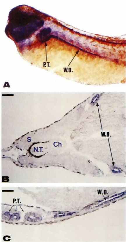 Fig. 8. Ets-2 expression in the pronephric tubules and growing pronephric duct. (A) Whole-mount 10 situ hybridIzation with an ets-2 specific probe, on stage 37/38 embryo. The pronephric tubules (PT) and the Wolffian duct (WD) are strongly labeled. (B) Transverse section of a stage 37/38 embryo after whole-mount hybridization, showing the strong labeling of the epithelial structure of the Wolff/an duct. Dorsal is to the left. (C) Horizontal section of a stage 37/38 embryo after whole-mount hybridization, showing the labeling of the pronephric tubules and Wolffian duct. Anterior is to the left. Bars, 100 p.m. Ch, notochord; NT. neural tube; PT. pronephric tubule: S, somite; WD, Wolffian duct.