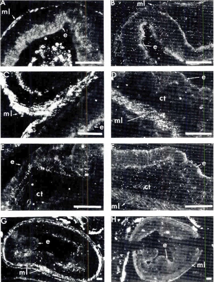 Fig. 9. In situ hybridization on sagittal sections of Xenopus gut from late developmental stages by using 35S-Iabeled ets-2 probes. (A,C,D,E,G) Antisense probe. (B,F,H) Control experiments using a sense probe. (A,B,C) Anterior part of small intestine from stage 60 animal. (D) Stomach of stage 62 Xenopus. (E,F) Pyloric portion of stomach from stage 62 tadpole. (G,H) Rectum of stage 60 animal. Ets-2 transcripts are located in both epithelial and muscular layers e. epithelium: mI. muscular layer: ct. connective tissue. Bar, 40.um.