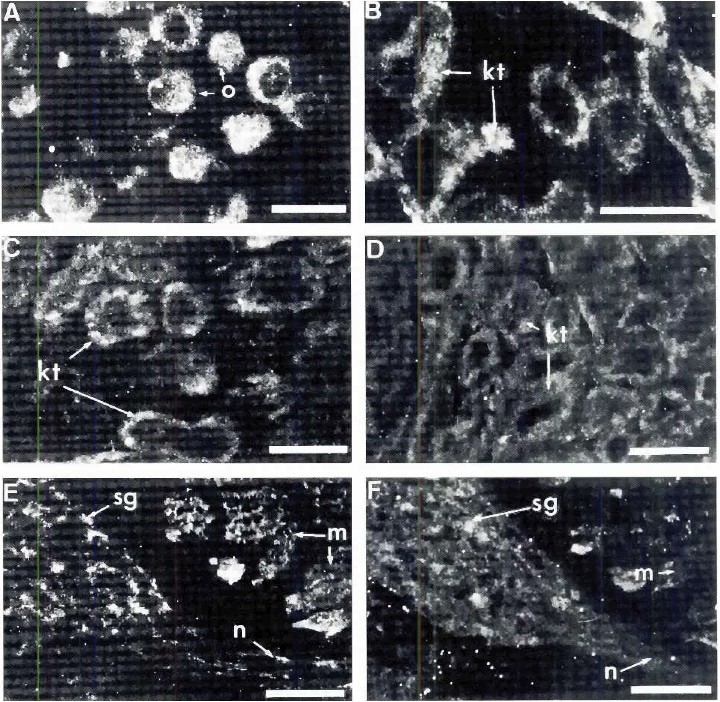 Fig. 10. In situ hybridization on sagittal sections of immature ovary and in Xenopus adult organs by using 35S-labeled ets-2probes. (A,B,C,E) Antisense probe; (D,F) control experiments with sense probe. (A) Ets-2 transcripts are detected In oogonia Included in ovary of stage 62 female. (B) Stage 60 tadpole showing the presence of ets-2 transcripts In the kidney tubules. (C,D) Ets-2 transcripts are detected In adult kidney. (E,F) Ets-2 is expressed In muscles and in spinal ganglia at the level of developing forelimb bud in stage 56/57 tadpoles, o, oogonium; kt. kidney tubules. sg, spinal ganglion; m, muscle; n, nerve. Bar, 40 um