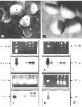 Fig. 1. Whole-mount in situ hybridization for ets-1 and ets-2 transcripts; RT/PCR quantification in the different regions of the oocyte. (AI ers-7 rranscnpr derection in oocytes of different developmental stages. usmg a digoxlgenm labeled antisense riboprobe. Note the apparent uniform distributIOn of the stalnmg in small oocytes (white arrowheads) and the confining of the transcripts to rhe anrmal pole of larger oocytes (red arrowheads). (B) ets- 2 transcflpts detection in shed eggs, cut into halves prior to hybridization with a digoxlgenin- labeled antisense ets-2 probe. Note the confmement of the signal to the anrmal pole. IC) RT/ PCR analysIs of ets-l and ers-2 transcripts in rhe animal pole, Intermediare zone and vegetal pole of the oocyte. (1.21ets-l detection; (3,41ets.2 detection: (5,6) control on 185 rRNA: (7,8)