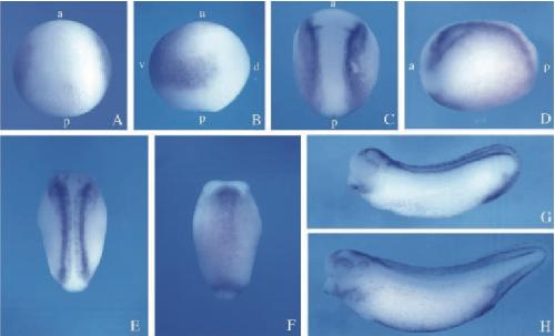 Fig. 3. Spatial distribution of msx1 transcripts during early Xenopus development. Whole-mount in situ hybridization of albino embryos using a digoxigenin-labeled antisense msx1 probe. msx1 transcripts are detectable from midgastrula stages (stage 11; A,B). Dorsal (A) and lateral (B) views indicate the localization of msx1 transcripts in the ventral animal and marginal regions of the embryo. Dorsal (C) and lateral (D) views at early neurula stages indicate that the expression of msx1 gradually divides into ventral and dorsal regions, and that the dorsal expression is restricted to the border of epidermis and neural plate. a, anterior; p, posterior; d, dorsal; v, ventral. (E,F) Dorsal and ventral views of stage 17 embryos, respectively, and anterior is up. As the neural tube closes, the expression of msx1 is observed in the dorsal neural tube (E) and the heart and around blastopore on the ventral side (F). At tailbud (G) and tadpole (H) stages, expression is detected in fin, cement gland, dorsal neural tube, otic vesicle and, broadly, in the ventral region.