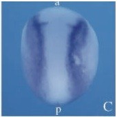 msx1 (msh homeobox 1) gene expression in Xenopus laevis embryo via in situ hybridization, NF stage 13-14, dorsal view, anterior up.