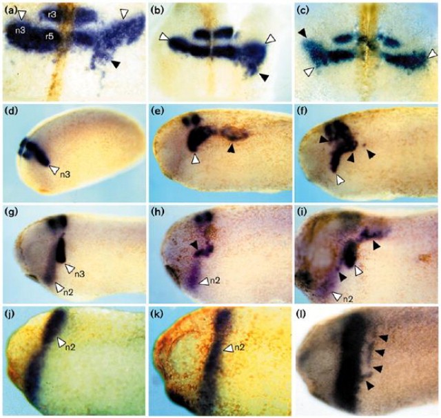 Figure 3. Effects of expressing truncated EphA4 and EphB1 on third arch neural crest. RNA encoding truncated EphB1 (a), EphA4, (b,e) or a mixture of these RNAs (c,f,hâl) was microinjected into one cell of two-cell stage Xenopus embryos. The embryos were allowed to develop to stage 21 (aâc), or stages 23â25 (dâl), then fixed and in situ hybridisation carried out. (aâc) Dorsal views of flat mounted embryos, with the injected side to the right in (a,b), and on the left in (c). (d,g) Uninjected side of injected embryos. (e,f,hâl) Injected side of embryos. Krox-20 gene expression was detected as a marker of third arch neural crest (aâf), Krox-20 plus EphA2 (Eck) to detect third arch (stronger signal) plus second arch (weaker signal) neural crest (gâi), or EphA2 alone (j). Krox-20-expressing neural crest cells were observed in ectopic locations; the extent of this disruption varied between embryos within an experiment and between different batches of embryos. To further analyse whether second arch neural crest was affected in embryos in which third arch crest migration was disrupted, DIG-labelled EphA2 probe (k) then fluorescein-labelled Krox-20 probe (l) were detected sequentially. The second arch stream is normal, but ectopic caudal third arch crest cells are detected; the appearance of this embryo has changed due to loss of pigmentation during processing. The white arrows indicate a normal restricted stream of third arch (n3) and second arch (n2) neural crest, and the black arrows indicate cells present in abnormal locations.