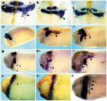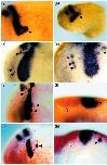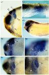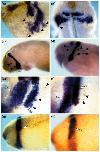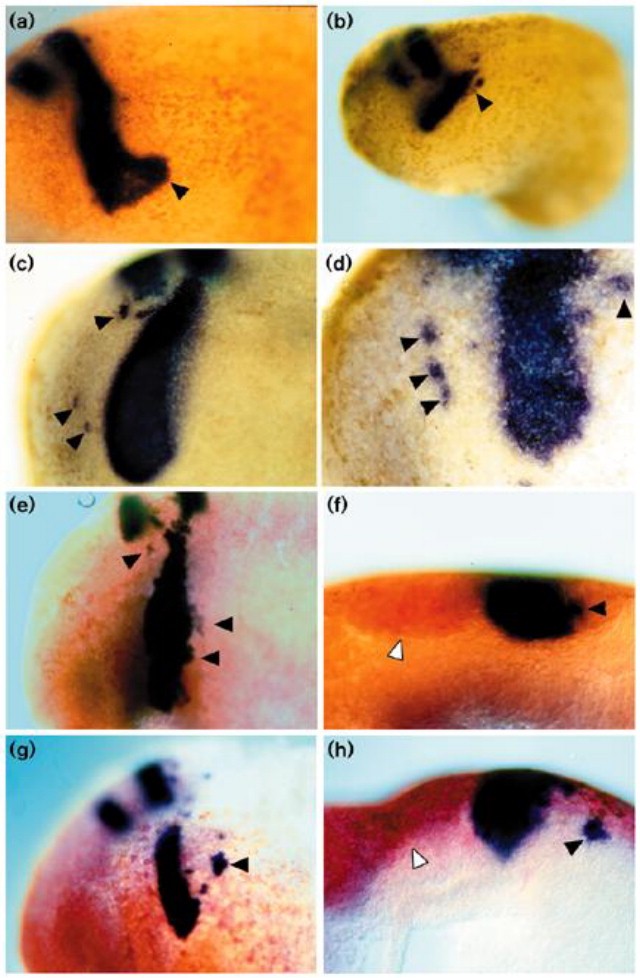 Figure 6. Effects of targeted expression in neural crest. RNA was injected into the A1 or A2 blastomeres of 32-cell embryos in order to target expression of ephrin-B2 or truncated receptors to ectodermal derivatives, including branchial neural crest. Krox-20 expression was then detected by in situ hybridisation (blue signal). In some experiments, fluorescein-dextran was co-injected as a lineage tracer and detected using alkaline-phosphatase-conjugated, anti-fluorescein antibody and Fast Red substrate (red signal in (eâh)). (aâf) Embryos injected with RNA encoding truncated EphB1 plus EphA4 shown in lateral views (aâe) and in a coronal section (f) through the embryo shown in (e). The latter embryo has some non-specific staining that is often seen using Fast Red substrate. (g,h) Embryo injected with RNA encoding ephrin-B2 shown in a lateral view (g) and coronal section (h). Ectopic Krox-20-expressing cells are indicated by black arrows, and the lineage tracer in branchial neural crest by white arrows.