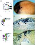 Figure 2. Expression of EphA4 and EphB1 in the branchial region. Whole-mount in situ hybridisation was carried out to detect EphA4 and EphB1 expression during branchial neural crest migration. (aâe) Expression pattern of EphA4. (a) A stage 19 embryo shown in dorsalârostral view. Note the ventral domain of EphA4 expression in the presumptive branchial arch region coextensive with the EphA4-expressing neural crest. (b) A stage 23 embryo show in lateral view. EphA4-expressing neural crest has started to migrate, and the ventral domain has narrowed to a stripe at the rostral margin of the third arch. (c) A stage 26 embryo shown in lateral view. EphA4-expressing neural crest has migrated into the third branchial arch. (d) Coronal section through the ventral domain of EphA4 expression in the presumptive branchial arch region of a stage 19 embryo. Expression occurs in visceral mesoderm, and at lower levels in underlying endoderm. (e) Coronal section through ventralEphA4 expression domain in a stage 23 embryo. Expression is at low levels in visceral mesoderm, and at higher levels in a broader domain in the underlying endoderm. (f) Krox-20 gene expression in a stage 26 embryo. Expression in neural crest is restricted to the third branchial arch. (gâi) Expression pattern of EphB1. (g) At stage 25, EphB1 expression occurs in migrating third and fourth arch neural crest, and thus appears as a broader domain than EphA4. Expression also occurs in a ventral domain coextensive with the neural crest; the border of the neural crest is difficult to see because expression occurs at similar levels in the ventral region. (h) At stage 27, expression occurs in the fourth and more caudal branchial arches. (i) Section through stage 25 embryo. Expression is detected in neural crest, visceral mesoderm and endoderm. (j) Lateral view of EphA4 expression at stage 19 (see (a)), showing the ventralEphA4 expression domain in more detail. (kâm) Detection of EphA4 (strong staining in neural crest) plus EphB1 (weaker staining) expression during neural crest migration at stages 23 (k), 24 (l) and 26 (m). EphB1 expression extends caudal to EphA4 expression both in third arch neural crest and in the ventral domain. Abbreviations: r3/5, rhombomeres 3/5; n3/4, neural crest destined for third/fourth arch; v, ventral expression domain; fb, forebrain; cg, cement gland; pn, pronephros; ec, ectoderm; m, mesoderm; en, endoderm.