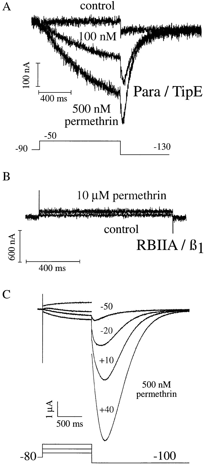 The Drosophila para sodium channel alpha subunit was expressed in Xenopus oocytes alone and in combination with tipE, a putative Drosophila sodium channel accessory subunit. Coexpression of tipE with para results in elevated levels of sodium currents and accelerated current decay. Para/TipE sodium channels have biophysical and pharmacological properties similar to those of native channels. However, the pharmacology of these channels differs from that of vertebrate sodium channels: (a) toxin II from Anemonia sulcata, which slows inactivation, binds to Para and some mammalian sodium channels with similar affinity (Kd congruent with 10 nM), but this toxin causes a 100-fold greater decrease in the rate of inactivation of Para/TipE than of mammalian channels; (b) Para sodium channels are >10-fold more sensitive to block by tetrodotoxin; and (c) modification by the pyrethroid insecticide permethrin is >100-fold more potent for Para than for rat brain type IIA sodium channels. Our results suggest that the selective toxicity of pyrethroid insecticides is due at least in part to the greater affinity of pyrethroids for insect sodium channels than for mammalian sodium channels.
