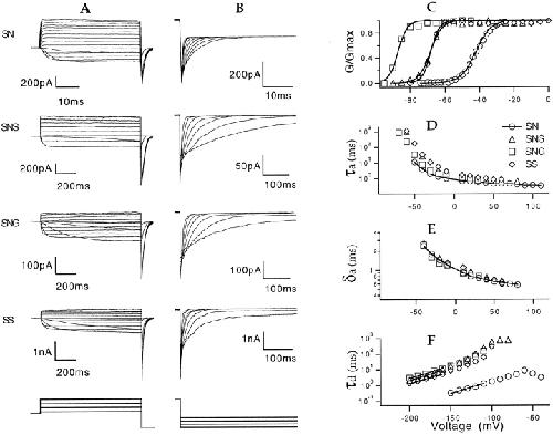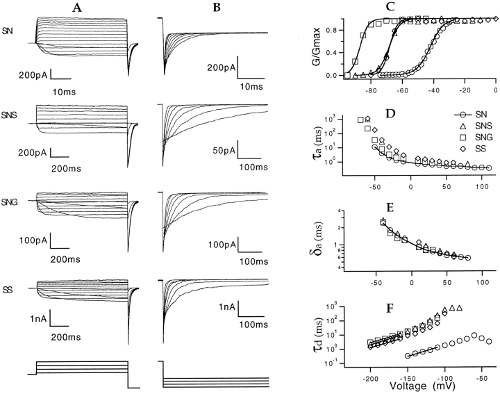 Figure 2. Macroscopic currents from cell-attached patch recordings of the various channel types. (A) Activation currents were induced by depolarizing pulses from a −100-mV holding potential to potentials of: −50 to 100 mV (SN); −80 to 100 mV (SNS); −80 to 30 mV (SNG); and −80 to 60 mV (SS); all in steps of 10 mV except 20 mV for SNS. The post pulse was −140 mV. (B) Tail currents were recorded at voltages of −70 to −150 mV (SN) and −110 to −170 mV (SNS, SNG, and SS) after prepulses to 40 mV (SN) or 0 mV (SNS, SNG, and SS). Potassium ion concentration was 140 mM on each side of the patch. Currents were filtered at 1 kHz. Note the different time scale for SN currents. (C) Representative G-V curves for each channel type, calculated from the macroscopic currents assuming a linear I -V relationship. Superimposed on each curve is a fit of a Boltzmann function. The midpoint voltage V1/2 and effective charge q for each channel type were −41.7 ± 2.7 mV, 5.1 ± 1.1 e0 (SN, n = 3); −66.3 ± 3.4 mV, 7.5 ± 1.2 e0 (SNS, n = 6); −87.9 ± 1.9 mV, 9.2 ± 0.8 e0 (SNG, n = 3); −66.8 ± 2.8 mV, 10.7 ± 1.6 e0 (SS, n = 4). (D) Voltage dependence of the activation time constant τa, estimated by fits of an exponential function to the activation time course, starting from the time when the amplitude is 50% of the final value. (E) Voltage dependence of the activation delay time δa obtained in the same fits as the time at which the extrapolated exponential crosses the current baseline. (F) Voltage dependence of deactivation time constants τd estimated by single-exponential fits. The apparent charge q was 0.80 e0 (SN), 0.96 e0 (SNS), 0.84 e0 (SNG), and 0.83 e0 (SS), as estimated by fitting the last five data points (lines) with the exponential function τ(V) = τ(0)exp(qV/kT).