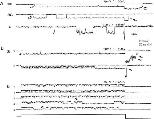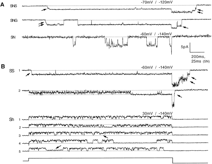 Figure 3. Single-channel currents from five channel types, recorded in inside-out patches. (A) Representative single- chan-nel current traces of the SN channel and its derivatives. Potassium ion concentration was 140 mM on each side of the membrane. Channels were activated by a depolarization from a −100-mV holding potential to −60 mV (SN) or −70 mV (SNS and SNG). The tail potential was −140 mV (SN) or −120 mV (SNS and SNG). Note the different time scale for the SN current, which also has a larger single-channel conductance. Some dwells in subconductance levels are indicated by arrows. (B) Single-channel currents of Shaker and its derivative SS. Two selected sweeps recorded in symmetrical 140 mM K+ show the “nonbursting” and “bursting” behaviors of SS. The first sweep contains a brief dwell at a sublevel during activation (arrow) as well as a clear “staircase” of conductances during deactivation. Also shown are five successive sweeps from a truncated Shaker B channel, recorded with 5 mM external K+. Some dwells at subconductance levels are indicated by arrows. For the recording from the NH2-terminal–truncated Shaker B channel, the pipette solution contained 5 mM K-aspartate, 135 mM NMDG-aspartate, 1.8 mM CaCl2, and 10 mM Hepes. All recordings were filtered at 1 kHz. The recordings of SN and SS currents used uncoated patch pipettes, which yielded larger background noise.