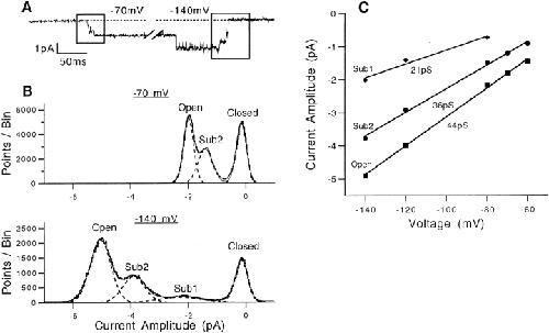 Figure 5. Amplitudes of the three current levels in SNS channels. (A) Representative current trace showing channel activation at −70 mV and deactivation at −140 mV. Boxes indicate regions of this trace used in constructing the amplitude histograms. (B) Amplitude histograms of the single- channel current at the two voltages, accumulated from portions of 380 sweeps as in A. Filter bandwidth was 1 kHz. Superimposed are fits of three (−70 mV) or four (−140 mV) Gaussian functions; the midpoint of each Gaussian is taken to be the mean current amplitude. The standard deviations (in pA) of the Gaussian components are as follows. For −70 mV: 0.25 (closed), 0.36 (sub2), 0.25 (open); for −140 mV: 0.30 (closed), 1.0 (sub1), 0.54 (sub2), 0.50 (open). (C) The mean current amplitudes at different voltages. The superimposed linear fits yield the slope conductances shown.