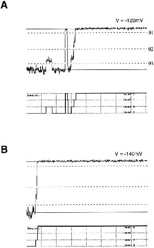 Figure 7. Examples of single-channel tail currents of SNS at −120 mV (A) and −140 mV (B). Solid lines show channel closed and open levels, while dashed lines indicate thresholds θ1, θ2, and θ3 at 10, 50, and 85% of the open level. Data filtered at 1 kHz. Below each trace is the idealized current time course.