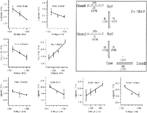Figure 9. Voltage dependence of transition rates. Rate constants were computed as described in Methods from single-channel activation time courses at −70 mV (n = 3 patches) and deactivation time courses at −100 (n = 2), −120 (n = 4), and −140 mV (n = 3). Superimposed on each plot is an exponential fit of the voltage dependence. The kinetic scheme (inset) summarizes the measurements from both activation and deactivation. Values for the rate constants (in s−1) are given for V = −120 mV. The partial valence associated with each rate constant is given in parentheses.