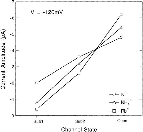 Figure 12. Amplitudes of each current level in SNS channels at −120 mV when K+, NH4+, or Rb+ is the external ion.