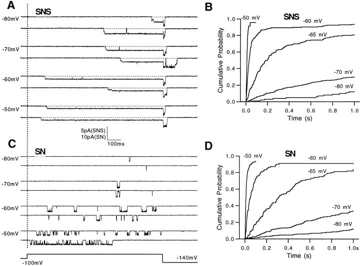 Figure 4. First latencies of SN and SNS single-channel currents. (A and C) Representative traces at various depolarizations in single-channel patches from oocyte expressing SNS (A) or SN (C). The dotted line marks the beginning of the depolarizations. (B and D). The cumulative first-latency distributions are plotted for SNS (B) and SN (D) at the potentials indicated. First latencies were measured as the time to first opening, to either sub- or main conductance level.