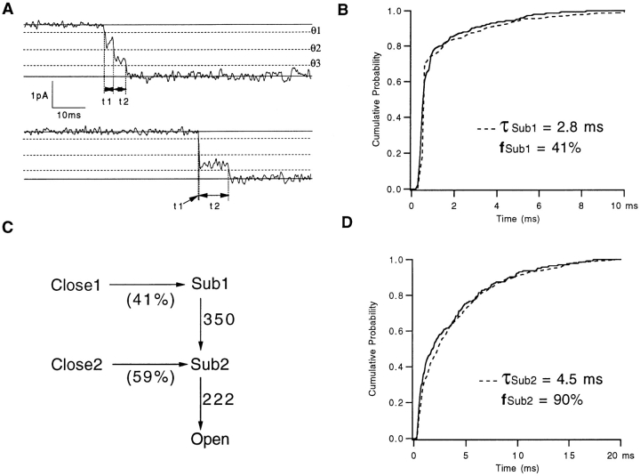 Figure 6. Sublevels of the SNS single-channel current during activation. (A) Representative traces at −70 mV. Solid lines show channel closed and open levels; dashed lines (θ1, θ2, and θ3) are thresholds at 10, 50, and 85% of the open amplitude. In the upper trace, the channel spends t1 = 2.9 ms in the sub1 state and t2 = 3.9 ms in the sub2 state before reaching the open state. In the lower trace, the channel appears to open instantaneously into sub2, but a finite t1 is measured because of filtering. Filter bandwidth is 1 kHz. (B) Cumulative histogram of measured dwell times t1 in sub1 (solid curve) accumulated from 140 events. The dashed curve is the cumulative distribution from a simulation of 250 events with mean lifetime τSub1 and fraction fSub1 of nonzero dwells in sub1 as given. (C) A scheme for channel activation that accounts for the distributions of t1 and t2. Channels can open through two distinct pathways, allowing sub1 to be skipped but always traversing sub2. (D) Cumulative histogram of 140 dwell times at sublevel sub2. The dashed curve is from a simulation of 250 events with the given mean dwell time and fraction of nonzero dwells.