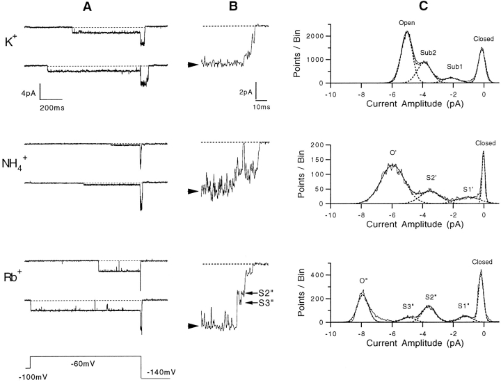 Figure 10. SNS single-channel currents with K+, NH4+, or Rb+ as the permeant ions. (A) Single-channel currents recorded from inside-out patches, with 140 mM of the test ion in the pipette and 140 mM K+ in the bath. The voltage protocol is shown at the bottom. Note the small current in NH4+ at −60 mV, due to proximity to the reversal potential of −45 mV under these conditions. (B) Representative tail currents at −140 mV for each permeant ion. The open level is marked by an arrowhead. The S2′′ and S3′′ sublevels in Rb+ current are also indicated. (C) Amplitude histograms of tail currents at −140 mV for each permeant ion, accumulated from recordings filtered at 1 kHz. The data for K+ are the same as in Fig. 5 C; for NH4, the standard deviations of the fitted Gaussians are 0.1, 1.0, 0.9, and 1.1 pA for closed, sub1, sub2, and open levels, respectively. For Rb+, the standard deviations are 0.2 for the closed level, 0.6 for each sublevel, and 0.5 for the open level.