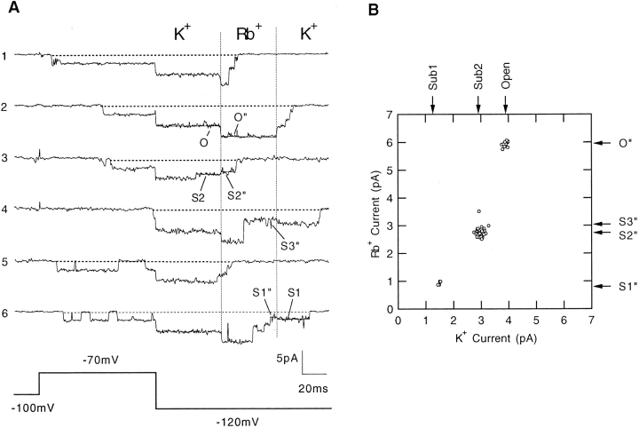 Figure 11. Solution switching experiment. (A) In an outside- out patch, the channel is activated by a depolarization to −70 mV from the −100-mV holding potential. Switching of the external solution occurs during the tail current at −120 mV, as shown by the dotted lines. In traces 1, 2, and 4, the K+ → Rb+ switching occurs while the channel is at the open level; in traces 3 and 5, it occurs while the channel is at sub2 sublevel. Trace 4 shows Rb+ → K+ switching while the channel is at sub2. Trace 6 shows Rb+ → K+ switching while the channel is at sub1. The pipette solution contained 130 mM K-aspartate, 10 mM KCl, 1 mM EGTA, 10 mM Hepes, and the bath solution contained 140 mM K-aspartate, 1.8 mM CaCl2, 10 mM Hepes; each was adjusted to pH 7.3. (B) Scatter plot of mean current values obtained before and after solution switching. Mean current was calculated only from the traces in which the current levels were stable for at least 5 ms both before and after the solution switching.
