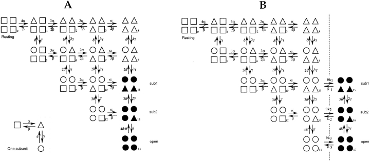 Figure 13. Two speculative gating schemes. (A) The scheme of Zagotta et al. (1994b) is shown, in which a single subunit undergoes two voltage-dependent conformational transitions (inset) to reach a permissive state (circles). Subunit transitions occur independently, with the exception of a slowed transition from the open state 14 to state 13. The scheme has been modified to identify sublevels sub1 and sub2 with states in which two or three subunits are in the permissive state. (B) The scheme Is modified to include a distinct allosteric transition (dotted line) that follows activation of the subunits. The allosteric transition is assumed to be very rapid and switches between fully conducting and nonconducting states. Allosteric equilibria are influenced by a common factor θ that is greatly increased by the T442S mutation. In both schemes, the conducting states are represented by filled symbols.