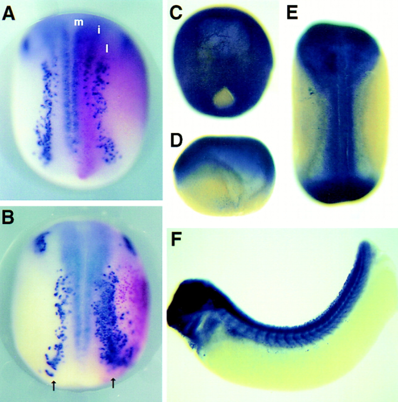 (A) and (B) show whole-mount Xenopus embryos at the neural plate stage hybridized with an N-tubulin probe. Normally, three stripes of primary neurons, medial (m), intermediate (i), and lateral (l), are present on each side of the neural plate (A). RNA encoding lacZ alone (A) or RNAs encoding both lacZ and MKUZDN (B) were injected into one cell of a 2â4 cell stage Xenopus embryo, and embryos were fixed at the neural plate stage. lacZ RNA served as a tracer to follow the distribution of the injected RNAs and was revealed by a lacZ substrate that gave a red color upon histochemical reaction. The lacZ negative side indicated the uninjected side and served as a control. Injection of RNA encoding MKUZDN resulted in extra N-tubulin positive cells as compared to the uninjected side (B) or to embryos injected with lacZ RNA alone (A). Extra neurons were observed in 72% (n = 156) of the embryos injected with MKUZDN. Note that these extra N-tubulin positive cells were confined to domains of primary neurogenesis and were not observed at ectopic positions.