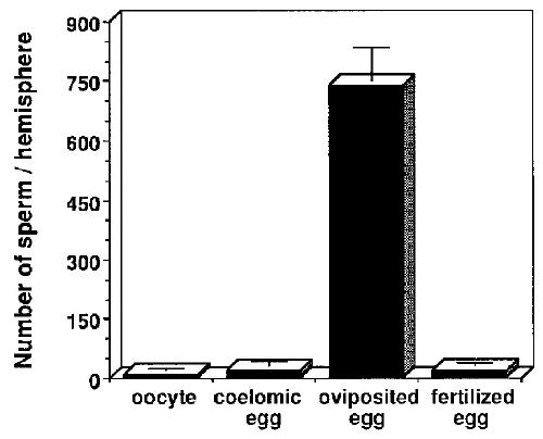 FIG. 1. Measurement of the number of sperm bound to one hemi-sphere of an oocyte, coelomic egg, dejellied oviposited egg, or dejel-lied fertilized egg (0.5 hr after fertilization). The number of bound sperm per hemisphere was determined by focusing stepwise through the depth of the top half of the egg, and counting sperm heads. (For details of the assay see Tian et al., 1997.) Bars indicate the standard deviation (SD) with n 15 eggs.