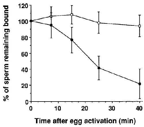 FIG. 7. Kinetics of detachment of sperm from dejellied eggs after