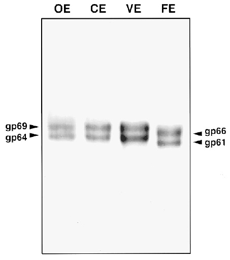 FIG. 2. Western blot showing the presence of gp69/64 glycoproteins in the OE, CE, and VE, and the modified forms, gp66/61, in the FE. Total envelope glycoproteins (1.5 mg) purified from different sources were separated by 7.5% SDSâPAGE and electroblotted onto a nitro- cellulose membrane. Polyclonal anti-gp69/64 was used as primary antibody for the immunoblot. See Materials and Methods for details.