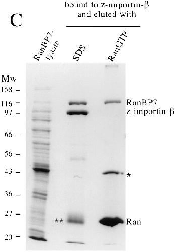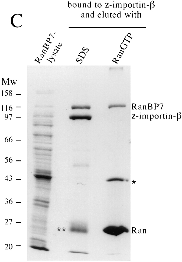 Figure 2. The RanBP7–importin-β interaction is regulated by Ran and appears unrelated to NLS-mediated nuclear protein import. (A) A Xenopus egg extract (high speed supernatant) was bound either to an immobilized BSA–NLS conjugate or an IBB domain. The starting material and the bound fractions were analyzed by immunoblots against RanBP7, importin-β, and -α. Note, whereas equal amounts of importin-β were found in both bound fractions, RanBP7 was recovered only with IBB column but hardly at all with the NLS conjugate. (B) z-Tagged RanBP7 was prebound to IgG Sepharose and used to bind importin-β out of a Xenopus egg extract (z is an IgG binding domain from Straphylococcus aureus protein A). Binding was with or without the addition of 10 μM RanQ69L GTP. Starting material and bound fractions were analyzed by immunoblotting against Ran and importin-β, but the z-tag is also detected by this procedure. Note that importin-β but no Ran bound to RanBP7 in the absence of RanQ69L. If however, the Ran mutant was added, importin-β binding was abolished, and instead, Ran (Q69L) was recovered in the bound fraction. (C) RanBP7 was expressed in E. coli. A lysate was prepared and subjected to binding to z-tagged importin-β that had been preabsorbed to IgG Sepharose. Elution from the beads was either with SDS, which also releases z–importin-β from the column, or with RanQ69L GTP which dissociates RanBP7 from importin-β. *, dimerized Ran; **, IgG light chain. |