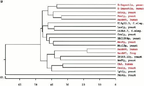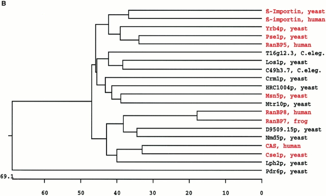 Figure 4. The RanBP7/importin-β/Cse1p superfamily. (A) Multiple alignment of amino acids 6–141 from RanBP7 with the NH2 termini of other proteins that have a similar NH2-terminal sequence motif. Positions in red match the consensus. The consensus was defined by the two most frequent amino acids in each position. Proteins named in blue have been shown to bind Ran (see main text and Fig. 5). S. pombe Crm1p and HRC1004 also match the motif but are not shown in the figure. (For accession numbers see Materials and Methods.) (B) Relationship between the proteins shown in A. The tree was calculated from the entire coding sequences and not just from the NH2 termini. Proteins named in red have been shown to bind RanGTP (see also below). |