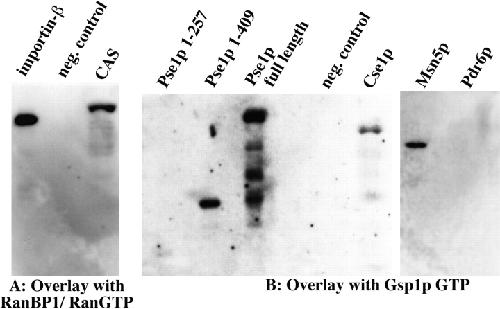 Figure 5. Human CAS and the yeast proteins Pse1p, Cse1p, and Msn5p are Ran (Gsp1p) binding. Indicated proteins were expressed in E. coli, and the total lysates were separated by SDS-PAGE and transferred onto nitrocellulose. The blot in A was probed with 10 pM Ran γ-[32P]GTP in the presence of a 5,000-fold molar excess of RanBP1, followed by autoradiography. The negative control was a lysate from E. coli expressing importin-α. The blots in B were probed with 10 pM Gsp1p γ-[32P]GTP (Gsp1p is Ran from S. cerevisiae). The negative control was importin-α, as in A. Pse1p 1–257 and Pse1p 1–409 are fragments of Pse1p comprising of the NH2-terminal 257 or 409 residues. Msn5p was expressed as an NH2-terminal fragment comprised of the NH2-terminal 682 residues. |
