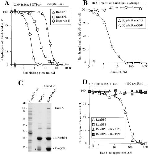 Figure 6. Enzymatic interactions of RanBP7 and RanBP8 with Ran. (A) RanBP7 and RanBP8 inhibit GAP induction of GTPase activity of Ran. 50 pM Ran γ-[32P]GTP was preincubated for 30 min with the indicated concentrations of importin-β, RanBP7, and RanBP8. 5 nM Rna1p (RanGAP from S. pombe) was added, and GTP hydrolysis was allowed for 5 min. Hydrolysis of Ran-bound GTP was measured as released γ-[32P]phosphate. When using a very low Ran concentration as in this experiment, the method can be used to estimate the KD of the Ran-binding proteins for RanGTP. These are ∼0.8, 25, and 3 nM for importin-β, RanBP7, and RanBP8, respectively. (B) Effect of RanBP8 on guanine nucleotide exchange on Ran. 30 pM Ran α-[32P]GDP or 50 pM Ran α-[32P]GTP were preincubated for 30 min with indicated concentrations of RanBP8. The exchange reaction was started by addition of 0.2 mM unlabeled GDP plus 2 nM of the exchange factor RCC1. After 5 min, Ran-bound 32P-labeled nucleotide was measured in a filter binding assay. Note, RanBP8 inhibits nucleotide exchange on RanGTP but not on RanGDP. (C) RanBP7 can form a trimeric RanBP7/RanGTP/RanBP1 complex. z-Tagged RanBP1 was prebound to IgG Sepharose. A RanBP7 lysate was subjected to binding to either immobilized RanBP1 alone or to an immobilized RanBP1/RanGTP complex. Elution was with SDS, which also releases the z-RanBP1 from the IgG Sepharose. Note, RanBP7 does not bind to RanBP1 alone, but it is specifically recovered with the RanBP1/RanGTP complex. *, IgG light chain that leaked from the column. (D) The GAP resistance of the RanBP7/RanGTP and the RanBP8/RanGTP complex is relieved by RanBP1. 100 nM RanGTP was preincubated for 30 min with indicated concentrations of RanBP7 or RanBP8. Buffer or 200 nM RanBP1 were added, followed immediately by 200 nM Rna1p. GTP hydrolysis was allowed for 5 min and measured as in A. |