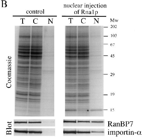 Figure 7. Characterization of RanBP7 transport between nucleus and cytoplasm. (A) RanBP7 was translated in the reticulocyte system in the presence of [35S]methionine and mixed with [14C]BSA, which served as an injection control. The mixture was then injected into Xenopus laevis oocyte nuclei either alone or together with 40 μM Rna1p, or with Rna1p and 80 μM RanQ69L. Proteins were extracted 5 or 90 min after injection. T, C, and N, indicate proteins extracted from total oocytes or after dissection from cytoplasmic or nuclear fractions, respectively. Proteins were analyzed by SDS-PAGE followed by fluorography. (B) Nuclei of Xenopus oocytes were injected either with buffer (control), or 10 μM Rna1p. Oocytes were dissected 6 h later, and the distribution of endogenous proteins was analyzed by SDS-PAGE followed by Coomassie staining, or by Western blotting with RanBP7 and importin-α antibodies. In the control, RanBP7 and importin-α are predominantly cytoplasmic. Nearly 50% of RanBP7 and ∼20% of importin-α accumulated in the nucleus, after nuclear Rna1p injection that inhibits re-export of RanBP7 and importin-α. *, Hemoglobin from the injection control. Rna1p stays nuclear after nuclear injection as judged by Western blotting (not shown). |