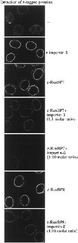 Figure 8. RanBP7 and RanBP8 bind to nuclear pore complexes. (A) Permeabilized cells were incubated as indicated with 300 nM z-tagged importin-β, RanBP7, or RanBP8 and with 300 nM or ∼3 μM untagged importin-β. z-Tagged proteins were visualized with 300 nM fluorescein-labeled human IgG added to the import assay. Ran and an energy mix were also added. Shown are confocal sections through the equators of the fixed nuclei. Note, z–importin-β, z-RanBP7, and z-RanBP8 give the typical nuclear pore staining pattern of narrow, punctate rims. NPC binding of RanBP7 and RanBP8 is competed by untagged importin-β, and a fluorescent signal is only observed in the cytoplasmic remnants surrounding the nuclei. |