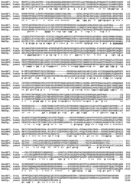 Figure 3. Molecular cloning of Xenopus RanBP7 and human RanBP8 and their similarities to S. cerevisiae Nmd5p. Xenopus RanBP7 was cloned from an oocyte library using partial peptide sequence information from the purified protein. RanBP8 was found in the data base as an expressed human sequence tag similar to RanBP7 and was subsequently cloned from HeLa cDNA. Shown are the aligned amino acid sequences from Xenopus RanBP7, human RanBP8, and S. cerevisiae Nmd5p. Residues identical in all three proteins are indicated by #, and similar amino acids by *. The sequence data for Xenopus RanBP7 and human RanBP8 are available from GenBank/EMBL/DDBJ under accession numbers U71082 and U77494, respectively. |