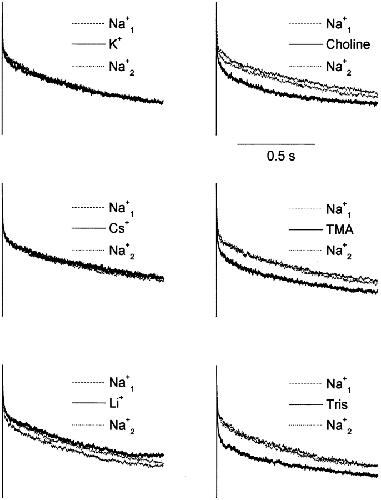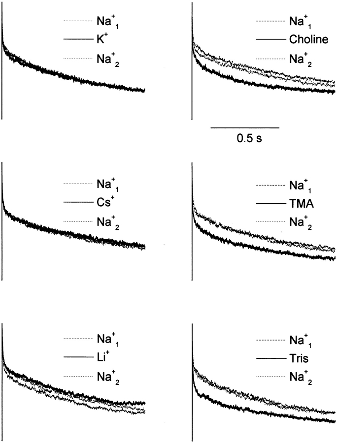 Figure 2. Effects of external cations on the slow decay of F1485Q Na+ channels currents. Whole-cell currents were evoked as described in the legend of Fig. 1. Recordings from one cell sequentially bathed in 150 mM of the indicated monovalent cations. Normalized peak currents.