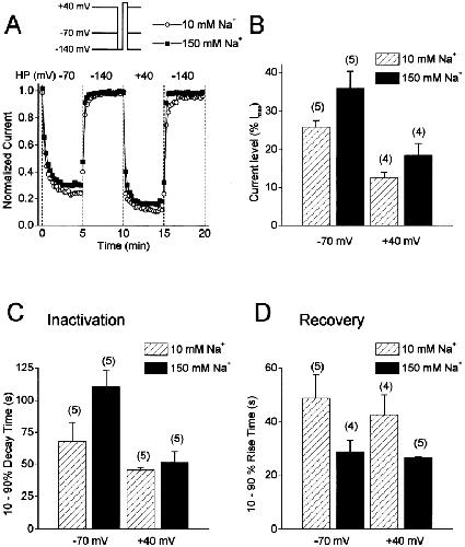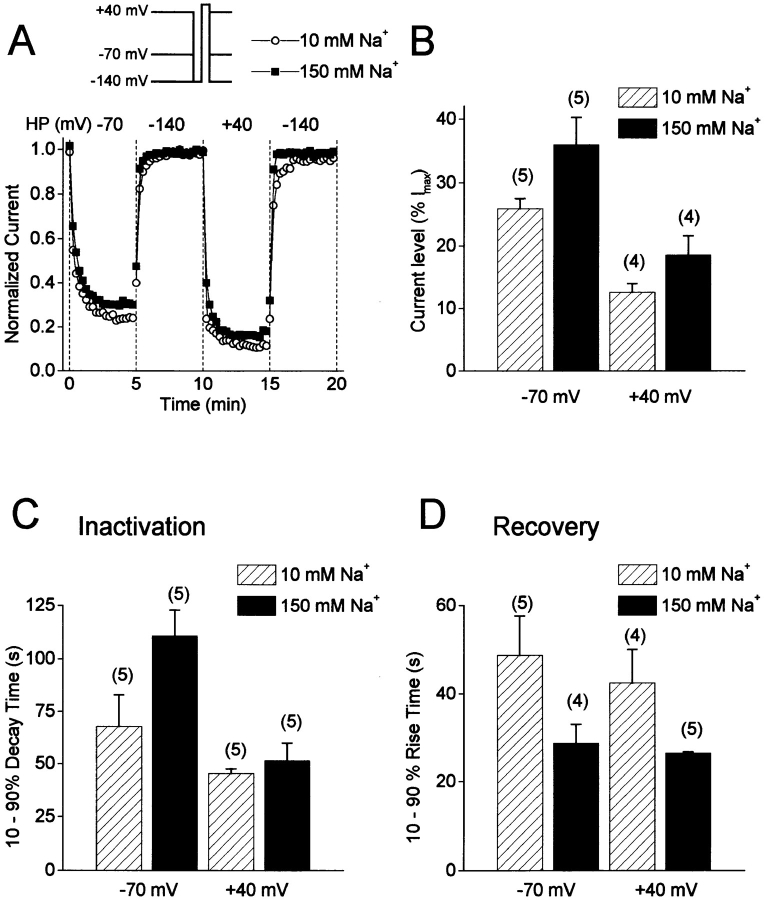 Figure 3. Slow inactivation of F1485Q channels in 10 and 150 mM [Na+]o. (A) Changes in peak current in response to changes in holding potential for two F1485Q-transfected cells bathed in either 150 (closed squares) or 10 mM Na+ (open circles). The cells were held at −140 mV for at least 10 min before the holding potential was sequentially changed every 5 min to −70, −140, +40, and −140 mV. Every 15 s during the entire protocol, a 20-ms recovery pulse to −140 mV was applied followed by a 20-ms test pulse to +60 mV (inset). The normalized peak current at +60 mV is plotted. (B) Current levels after 5 min at either −70 or +40 mV expressed as percent of the maximal current at a −140 mV holding potential. (C) 10–90% decay times for entry into slow inactivation at −70 and +40 mV. The 10–90% time corresponds to the time it takes for the current to decay from 10 to 90% of the maximal decay measured after 5 min at either −70 or +40 mV. (D) 10–90% times for recovery at −140 mV after 5 min of inactivation at either −70 mV or +40 mV. Numbers in parentheses are number of cells.