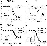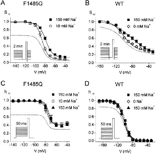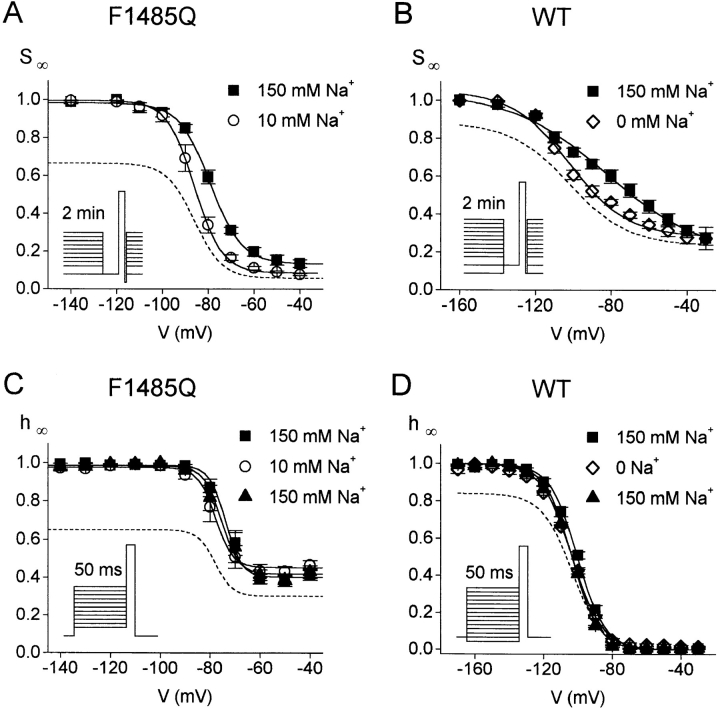Figure 4. Steady-state slow and fast inactivation in high and low [Na+]o. Steady-state slow inactivation (SΘ) curves for F1485Q (A) and WT hH1a (B). Transfected cells were held at holding potentials ranging from −160 to −30 mV in 10- or 20-mV increments. After 2 min at each holding potential, a 20-ms recovery pulse to −140 mV and a 9-ms test pulse to +60 mV were given (insets). The peak current measured at +60 mV is plotted as a fraction of the maximal current. (A) F1485Q SΘ curves. The data points are fit to the Boltzmann equation (solid lines) with midpoints at −79.0 ± 1.1 and −85.9 ± 1.7 mV and slope factors of 6.9 ± 0.4 and 6.0 ± 0.6 mV for 150 and 10 mM external Na+, respectively (n = 4 cells for 150 mM Na+ and n = 5 cells for 10 mM Na+). (B) WT SΘ curves. Best-fits to the Boltzmann equation have midpoints at −82.2 ± 2.8 and −102.0 ± 0.5 mV and slope factors of 25.4 ± 2.5 and 15.3 ± 0.6 for 150 and 0 mM Na+o, respectively (n = 3 cells for each [Na+]o). (C and D) Steady-state fast inactivation (hΘ) induced by a 50-ms prepulse to the indicated voltage from a holding potential of −160 mV (see insets). Test pulse, +60 mV. The peak current at +60 mV is plotted as a fraction of the maximal current. (C) F1485Q hΘ curves. Data shown are from 3 cells sequentially bathed in 150, 10, and 150 mM Na+. The best-fit Boltzmann curves have midpoints at −73.8 ± 2.4, −78.0 ± 2.6, and −75.6 ± 3.0 mV and slope factors of 3.27 ± 0.16, 3.47 ± 0.35, and 3.53 ± 0.36 mV for 150, 10, and 150 mM Na+o, respectively. (D) WT hΘ curves. Data from 3 cells transfected with WT hH1a and successively bathed in 150, 0, and 150 mM Na+. Inactivation curves are fitted to the Boltzmann equation with midpoints at −100.3 ± 0.9, −103.4 ± 0.6, and −103.5 ± 0.4 mV and slope factors of 8.0 ± 0.2, 8.8 ± 0.3, and 7.8 ± 0.2 for 150, 0, and 150 mM Na+o, respectively. In each panel, the dashed lines are the Boltzmann curves for 10 (F1485Q) or 0 mM Na+o (WT) multiplied by 0.67 (F1485Q) or 0.84 (WT), giving the expected reduction in Popen for the decrease in [Na+]o (Townsend et al., 1997).