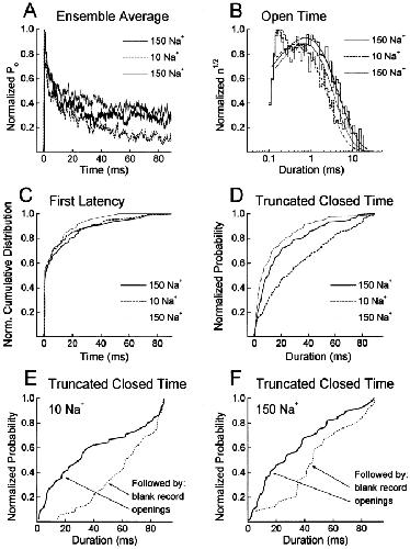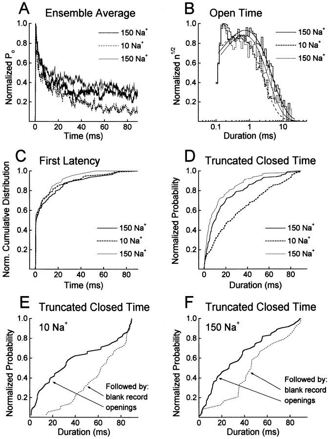 Figure 5. Single-channel data analysis. (A) Ensemble averages obtained from a two-channel outside-out patch successively bathed in 150, 10, and 150 mM Na+. Currents were activated by 90-ms pulses to +60 mV from a holding potential of −140 mV with a frequency of 0.5 Hz (n = 200 depolarizations for each bath solution). (B) Effects of [Na+]o on open time distributions. The normalized square root of the number of events per bin (n1/2) is plotted versus the logarithm of the open duration. The lines represent fits to single exponential distributions. Mean open times were 1.12 ± 0.03, 0.63 ± 0.01, and 0.93 ± 0.03 ms for 150, 10, and 150 mM Na+, respectively. Data from the two-channel patch shown in A. (C) Normalized first latency distributions, corrected for the number of channels, obtained for the same patch. (D) Cumulative distributions of the duration of the last (truncated) closing in a 90-ms depolarization for the same patch. (E and F) Cumulative distributions of the truncated closed time conditional on whether the following record contains openings (solid line) or not (dotted line) for a single-channel patch successively bathed in 10 (E) and 150 mM Na+ (F).