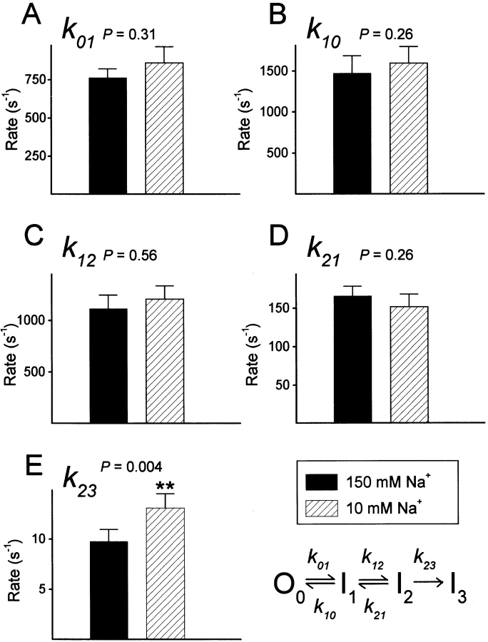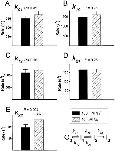 Figure 6. Maximum likelihood estimates of the rate constants for the kinetic model. Data are means ± SEM from 13 patches. P values are derived by ANOVA from the natural logarithm of the rate constants.