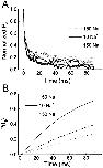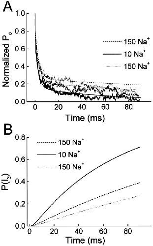 Figure 7. Probability of a channel being in the open (A) or the slow-inactivated state (B) during a depolarization. (A) Ensemble average of bursts in 10 and 150 mM external Na+. The lines represent the open probability during a burst calculated from the two-channel patch of Fig. 5. The estimated rate constants for this patch, using the model in Fig. 6, were (150 mM Na+, first exposure): k01 = 804 ± 18 s−1, k10 = 1,915 ± 85 s−1, k12 = 1,247 ± 89 s−1, k21 = 154 ± 10 s−1, k23 = 8.06 ± 1.53 s−1; (10 mM Na+): k01 = 1,357 ± 33 s−1, k10 = 1,865 ± 80 s−1, k12 = 739 ± 63 s−1, k21 = 102 ± 10 s−1, k23 = 19.2 ± 2.6 s−1; (150 mM Na+): k01 = 860 ± 15 s−1, k10 = 2,361 ± 67 s−1, k12 = 933 ± 46 s−1, k21 = 131 ± 8 s−1, k23 = 5.65 ± 2.08 s−1. The 4-state model predicts three time constants for the decay of burst open probability. These time constants were determined from the estimated rate constants by spectral expansion, and for this patch were (150 mM Na+): 0.27, 2.62, and 177.0 ms; (10 mM Na+): 0.27, 2.74, and 70.1 ms; and (150 mM Na+, first exposure): 0.25, 3.23, and 272.8 ms. (B) Probability for a channel to be in the absorbing inactivated state I3 (P(I)3) during a 90-ms pulse to +60 mV. P(I)3 was calculated from the above rate constants for the two-channel patch.