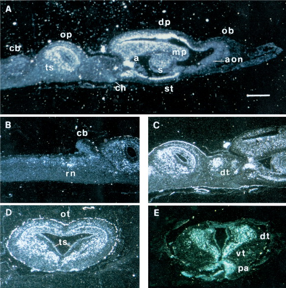 Fig. 5. Dark-field photomicrographs showing the distribution of X5-HT1A receptor mRNA in sagittal (AâC) and transverse sections (D,E) of Xenopus adult brain as revealed by in situ hybridization. In the sagittal section shown in A, the following regions appear labeled: dorsal pallium (dp), medialpallium (mp), septum (s), striatum (st), amygdala (a) in the telencephalon; optic tectum (op) and torus semicircolaris (ts) in the mesencephalon; the cerebellum (cb) as well as the olfactory bulb (ob) and the anterior olfactory nucleus (aon) are not labeled; ch, optic chiasma. (B) Sagittal section of the brain, showing the raphe nuclei (rn) of medulla oblongata labeled; the cerebellum (cb) is clearly not labeled. (C) Sagittal section of the brain showing the anterior, medial, posterior nuclei of the dorsal thalamus (dt) labeled. (D) Transverse section of mesencephalon showing the layer 6 of optic tectum (ot) and the torus semicircularis (ts) intensely labeled. (E) Transverse section of diencephalon: dorsal (dt), ventral (vt) thalamus and the preoptic area (pa) of hypothalamus are labeled. Scale bars=125 μm (in A); =150 μm (in B); =180 μm (in C); =250 μm (in D,E).
