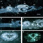 Fig. 4. Spatial expression of X5-HT1A transcripts in Xenopus development as detected by in situ hybridization. Dark-field photomicrographs showing X5-HT1A mRNA distribution on sagittal (A,B) and transverse (C,D) sections. In a stage-22 embryo, the autoradiographic signal is detectable in the rostral part of the brain stem (A); in a stage-31 embryo the labeling extends from the anteriormesencephalon to the posterior end of rhomboencephalon (B); in a stage-29 embryo the label is simmetrically located in a ventro lateral position of the mesencephalon on either side of the midline (C); (D) transversal section of a stage-41 embryo at the rostral mesencephalic level, including hypothalamus. Two pairs of autoradiographic grain clusters are visible in the brain: the more dorsal one is in correspondence of ventralmesencephalon, the other is in correspondence of hypotalamus; a strong signal is present on the inner nuclear layer (INL) of the retina. (E) Bright-field photomicrograph of a section through the eye showing that the INL of the retina appears labeled also at an older stage (44) of development. Scale bars=255 μm (in A); =400 μm (in B); =160 μm (in C,D); =20 μm (in E).