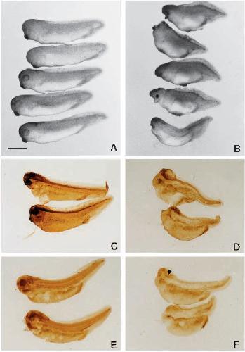 embryos (B,D,F) or control uninjected embryos (A,C,E)