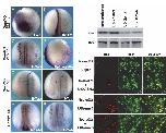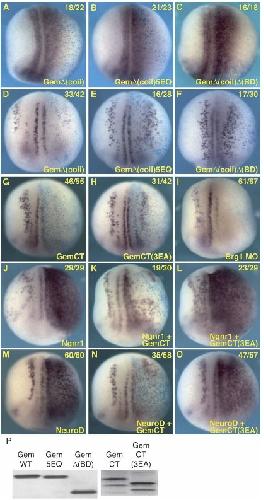 Figure 4. Misexpression of Gem prevents neurogenesis. (A), Two-cell stage Xenopus embryos were injected in one cell as indicated (yellow) with beta-galactosidase mRNA coinjection for lineage tracing and analyzed for NCAM (A) or N-tubulin (DO) expression. (CT) C-terminal region. 3EA is an alanine sub- stitution mutant of acidic amino acids 18890 in Xenopus Gem (which correspond to mouse Gem amino acids 17476). Like GemE174Q (Fig. 2F,G), Xenopus Gem 3EA has severely reduced Brg1 binding (data not shown). Numbers indicate the number of affected embryos over the total number of embryos. In situ for markers is stained purple, and blue X-gal staining marks the injected side. Injected sides were oriented rightward. (P) Expression levels of Gem variants injected into Xenopus embryos. Embryos were injected as indicated at the two-cell stage and harvested at stage 12 to prepare lysates. Ten embryos were used for each sample, and one embryo-equivalent of lysate was loaded per lane for Western blotting with anti-Myc antibody.